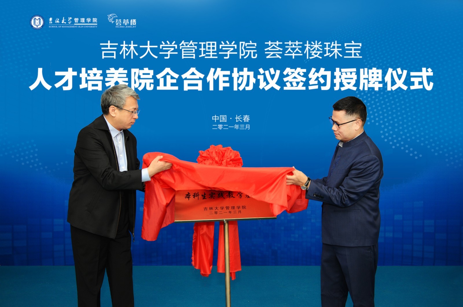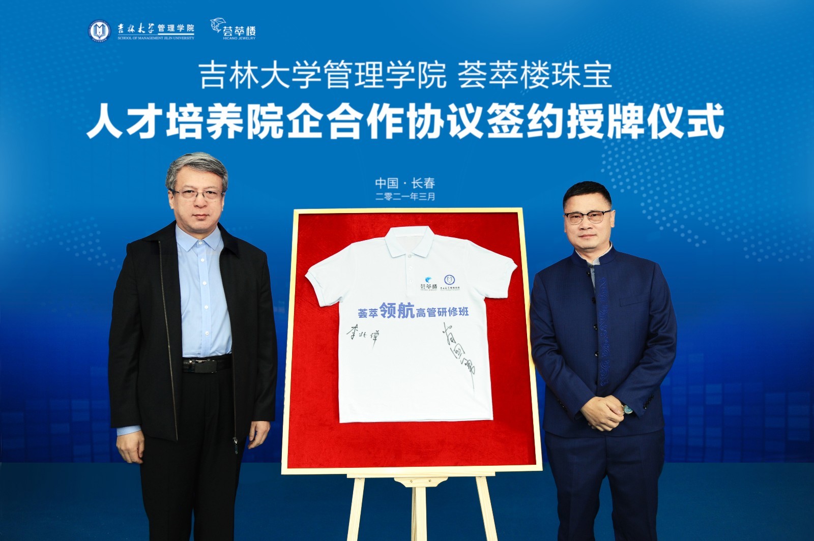 在双方共同见证下,深圳景福元记珠宝有限公司商学院院长柳红艳女士与吉林大学管理学院副书记彭鹏副教授签订战略合作协议。双方本着优势互补、共同发展的原则,达成“吉林大学管理学院实践教学基地”合作协议。李北伟院长亲自授予荟萃楼珠宝“本科生实践教学基地”牌匾;翁国勇总裁和李北伟院长共同在荟萃领航高管研修班的纪念版文化衫上签名,作为荟萃楼珠宝开启人才战略的见证。